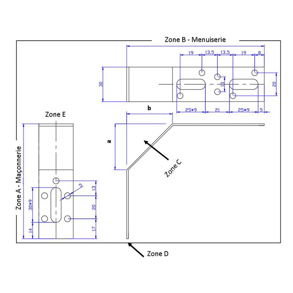 ZONE B - Oblong de 30*7 permet le passage du goujon de l’insert et le clipage éventuel d’une cale de rupture de pont thermique. Un ou plusieurs ø de 5,5 mm sont prévus pour un vissage complémentaire